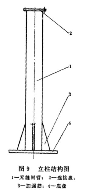 立柱用以支承平衡吊回轉(zhuǎn)部分及額定起吊零件的重量,所以要求有足夠的剛度。立柱的結(jié)構(gòu)一般選用大口徑無(wú)縫鋼管與連接盤(pán)、加強(qiáng)筋、底盤(pán)等零件焊接而成(圖9)。焊后要進(jìn)行退火處理。立柱的尺寸可參閱表2。