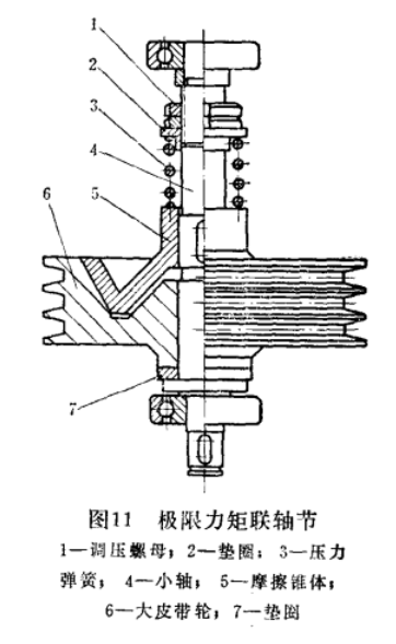 大皮帶輪6以動(dòng)配合裝在小軸4上。摩擦錐體5用鍵與小軸連接,但能在小軸上作軸向移動(dòng)。壓力彈簧3的壓力大小,靠調(diào)壓螺母1來(lái)調(diào)整。動(dòng)力的傳遞是通過(guò)壓力彈簧將摩擦錐體壓緊在大皮帶輪的錐面上,靠摩擦力矩將動(dòng)力由大皮帶輪傳遞到小軸上。當(dāng)起吊重量超過(guò)額定負(fù)載時(shí),磨擦面就會(huì)打滑,保證平衡吊各零件不致?lián)p壞,起到安全保護(hù)作用。同時(shí)也能使平衡吊的起升和停車(chē)比較平穩(wěn)。但是應(yīng)該注意,在使用中不可將壓力彈簧調(diào)得過(guò)緊,否則將失去作用。