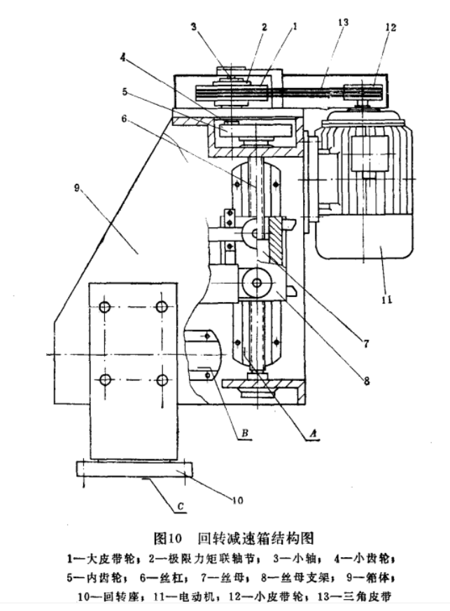 回轉(zhuǎn)減速箱由大皮帶輪1、力矩聯(lián)軸節(jié)2、小軸3、小齒輪4、內(nèi)齒輪5、絲杠6、絲母7、絲母支架8、箱體9以及回轉(zhuǎn)座10等零件組成?;剞D(zhuǎn)減速箱與電動(dòng)機(jī)11、電源控制箱及平衡臂相連接,其結(jié)構(gòu)如圖10所示。