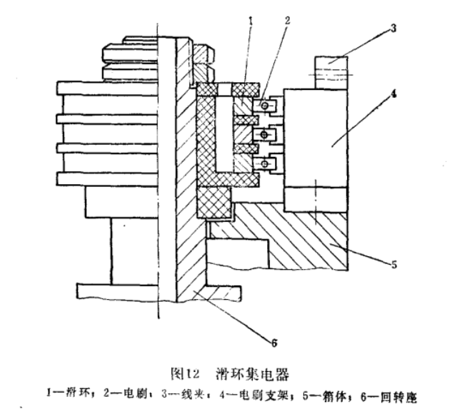滑環(huán)集電器的滑環(huán)1固定在不旋轉(zhuǎn)的回轉(zhuǎn)座6上,電源導(dǎo)線從立柱的底部引入,通過(guò)回轉(zhuǎn)座的中心孔接在滑環(huán)上。